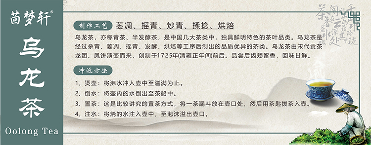 乌龙茶,亦称青茶、半发酵茶及全发酵茶,品种较多,是中国几大茶类中,独具鲜明汉族特色的茶叶品类。乌龙茶是经过采摘、萎凋、摇青、炒青、揉捻、烘焙等工序后制出的品质优异的茶类。乌龙茶由宋代贡茶龙团、凤饼演变而来,创制于1725年(清雍正年间)前后。品尝后齿颊留香,回味甘鲜。乌龙茶的药理作用,突出表现在分解脂肪、减肥健美等方面。在日本被称之为“美容茶”、“ 健美茶”。乌龙茶为中国特有的茶类,主要产于福建的闽北、闽南及广东、台湾三个省。四川、湖南等省也有少量生产。